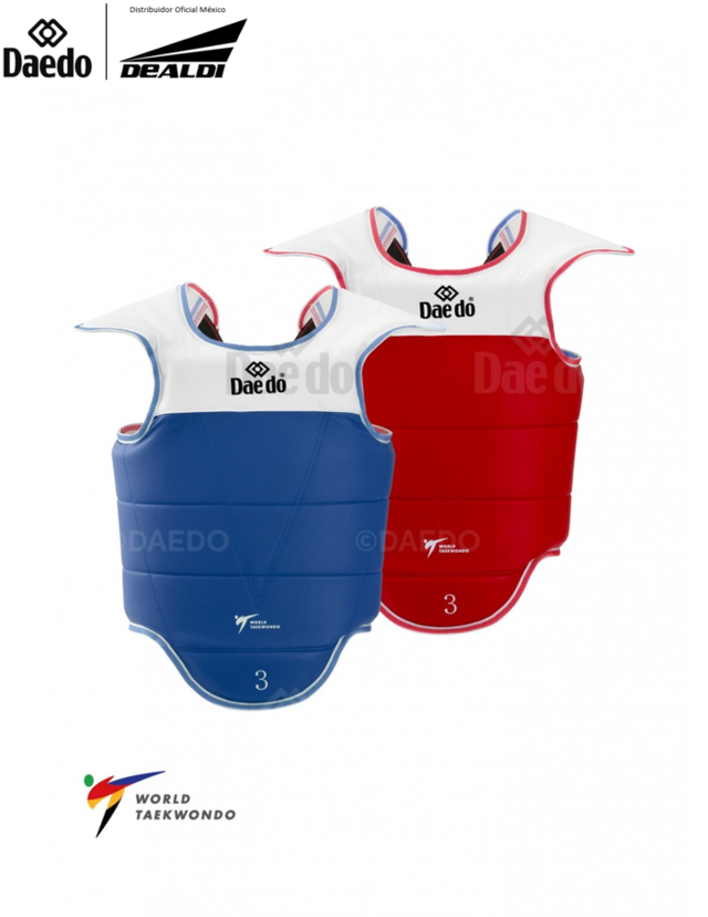- Características: Hecho generalmente de un material acolchonado o espuma densa, se ajusta al cuerpo para absorber los impactos de las patadas al torso. Es obligatorio en las competiciones.